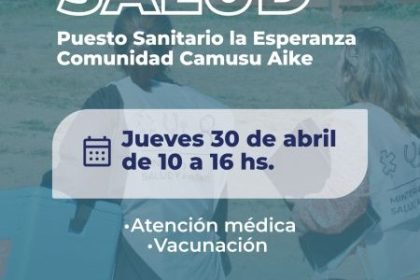 El Ministerio de Salud y Ambiente llevará adelante una nueva jornada de atención en el Puesto Sanitario La Esperanza y en la comunidad de Camusu Aike el próximo jueves 30 de abril, de 10:00 a 16:00 ho...