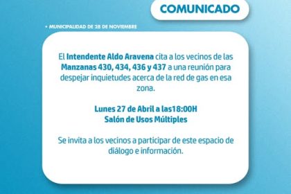 El Intendente Aldo Aravena convoca a los vecinos de las Manzanas 430, 434, 436 y 437 a participar de una reunión informativa. El encuentro tiene como objetivo despejar inquietudes y brindar informació...
