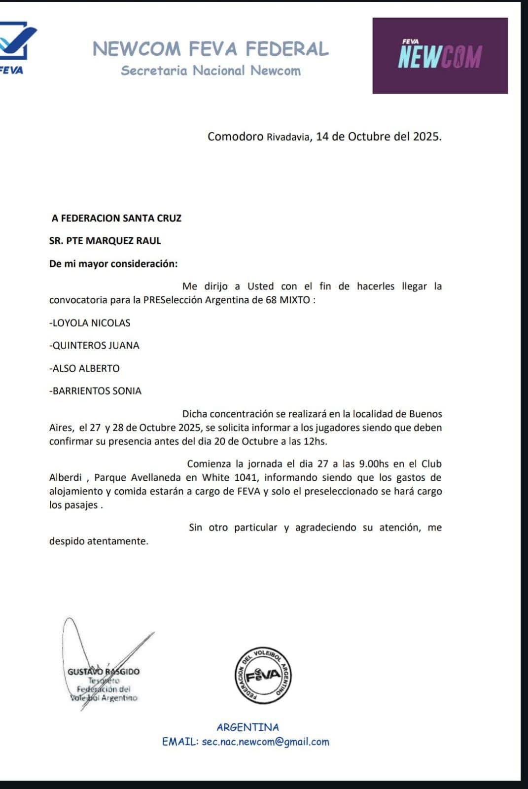 Comodoro Rivadavia — La Federación del Voleibol Argentino (FEVA), a través de su Secretaría Nacional de Newcom, confirmó la convocatoria de cuatro representantes de la provincia de Santa Cruz para int...
