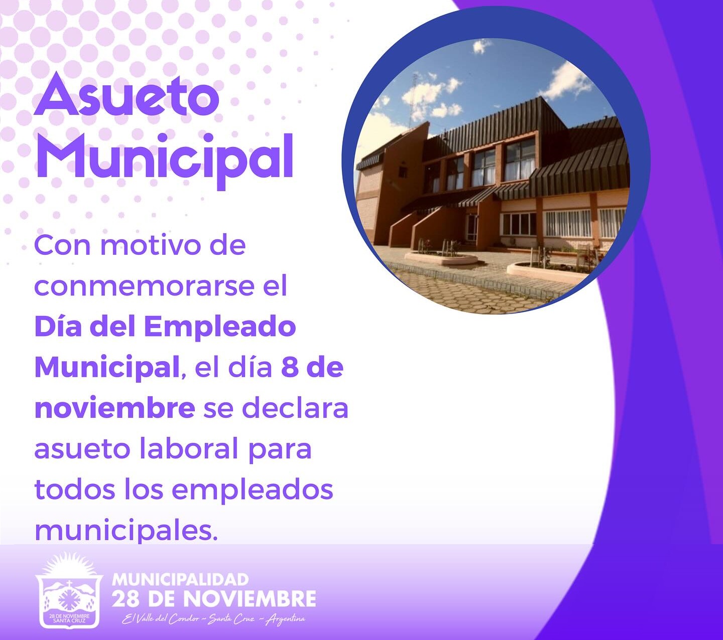 Con motivo de conmemorarse el Día del Empleado Municipal, el día 8 de noviembre se declara asueto laboral para todos los empleados municipales. El Sr. Intendente Aldo Aravena aprovecha la oportunidad ...