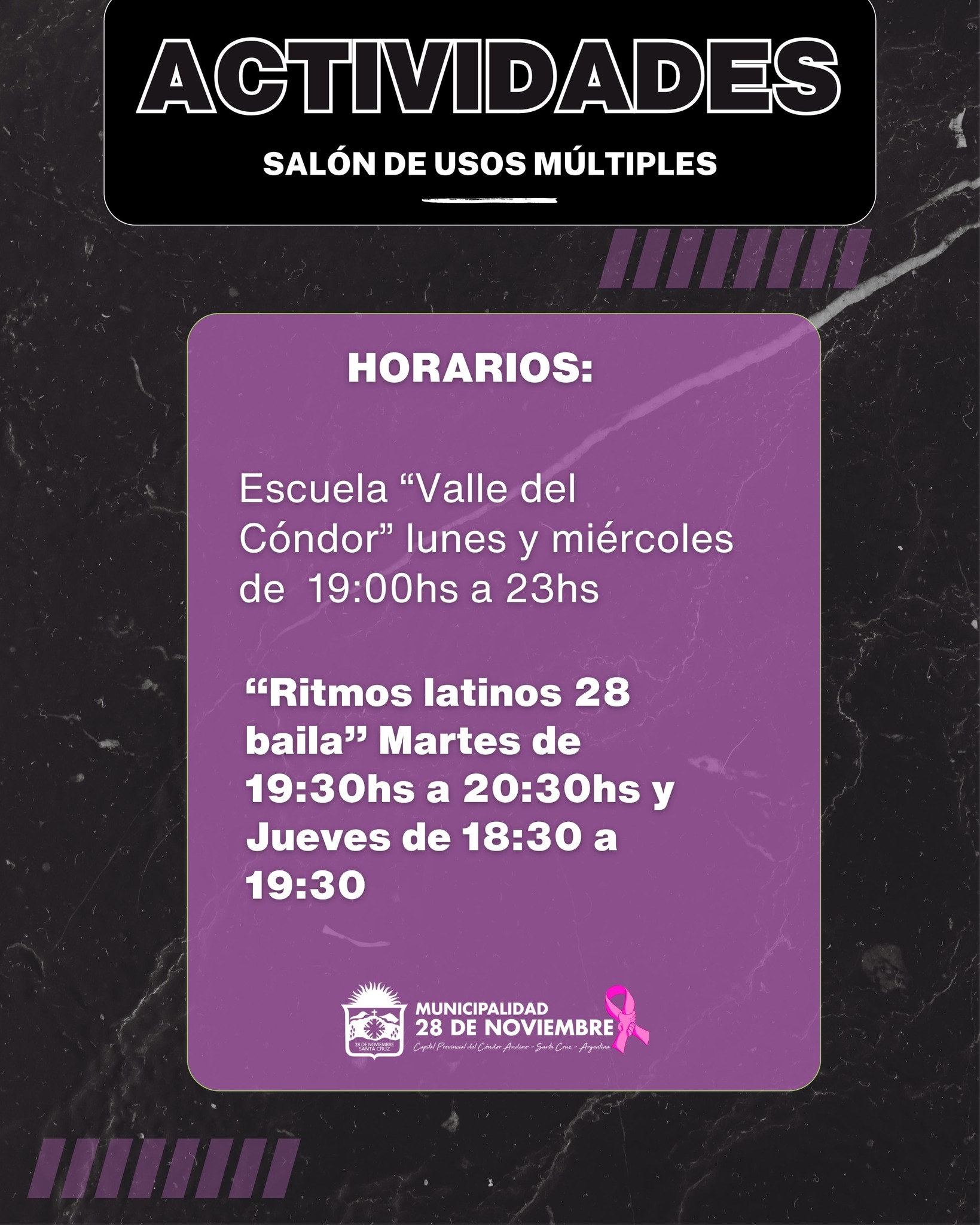 La Municipalidad de 28 de Noviembre invita a la comunidad a sumarse a las propuestas que llenan de ritmo y energía nuestras tardes y noches. Escuela “Valle del Cóndor” Lunes y miércoles | 19:00 a 23:0...