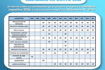 La Municipalidad de 28 de Noviembre informa a los vecinos que ya se encuentra vigente el Calendario Impositivo 2026, el cual forma parte de la Ordenanza N° 3741. Este calendario establece los plazos y...