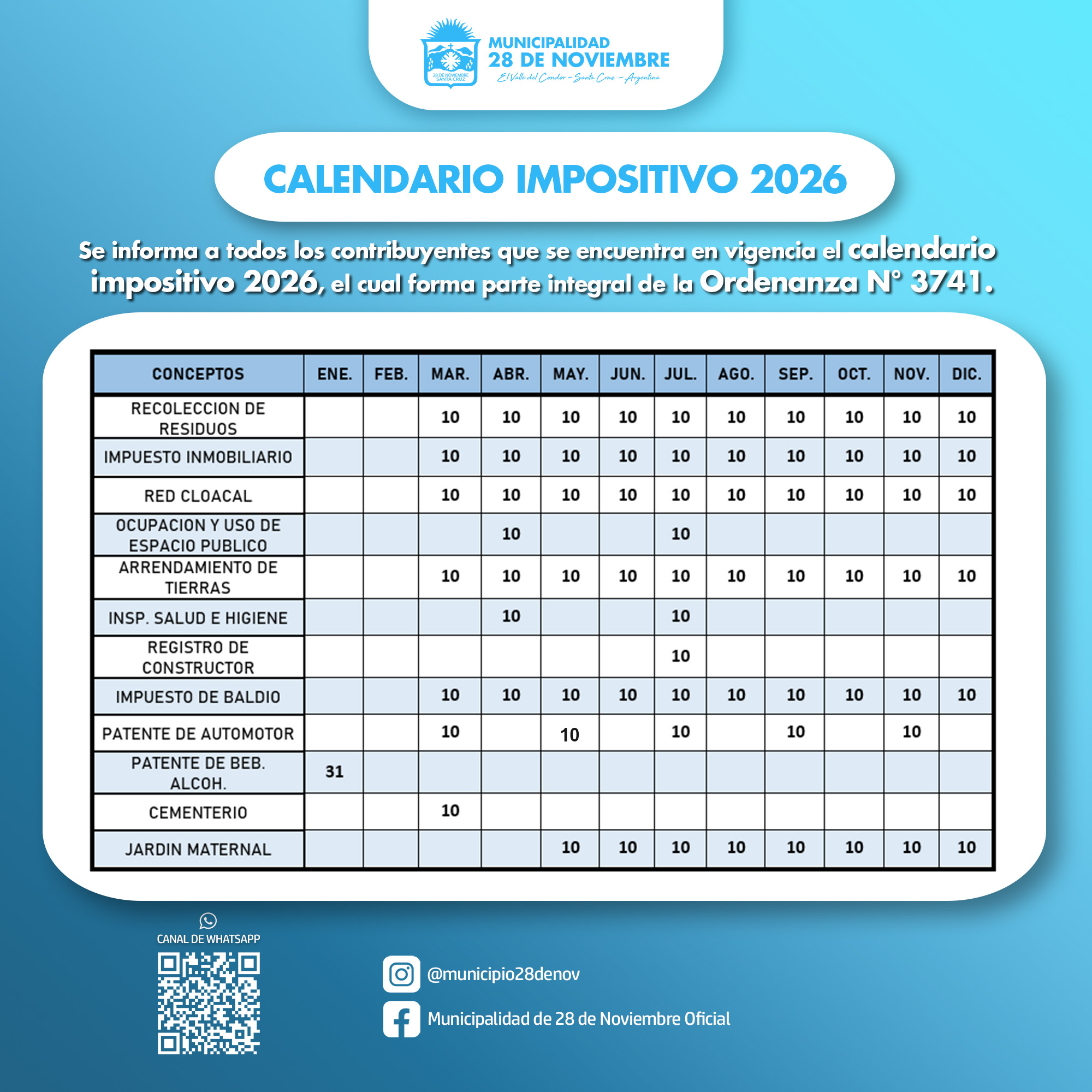 La Municipalidad de 28 de Noviembre informa a los vecinos que ya se encuentra vigente el Calendario Impositivo 2026, el cual forma parte de la Ordenanza N° 3741.
