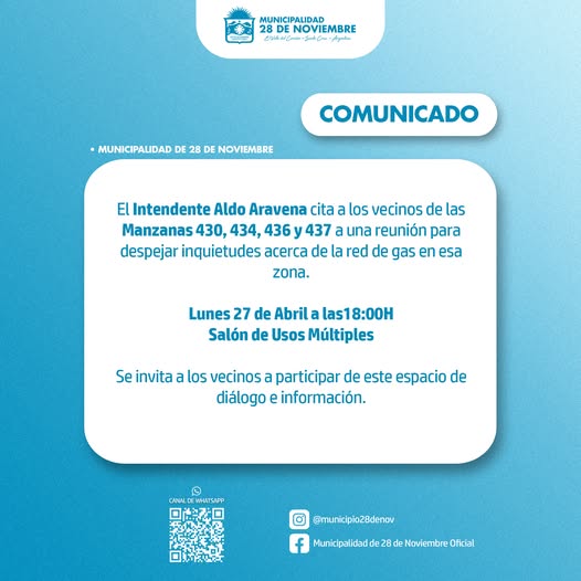 El Intendente Aldo Aravena convoca a los vecinos de las Manzanas 430, 434, 436 y 437 a participar de una reunión informativa.