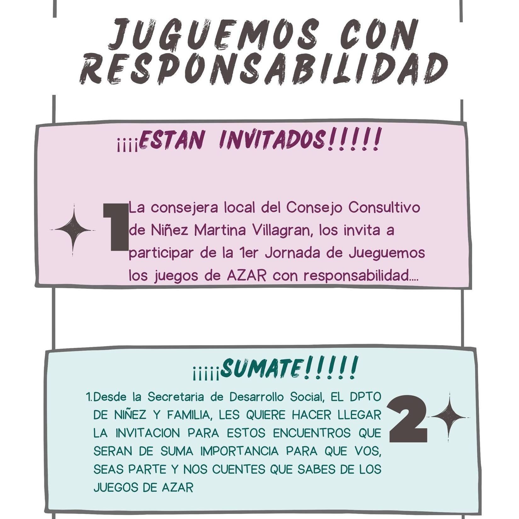 La Municipalidad de 28 de Noviembre, a través de la Secretaría de Desarrollo Social y el Departamento de Niñez y Familia, invita a participar de la 1° Jornada “Juguemos con responsabilidad”