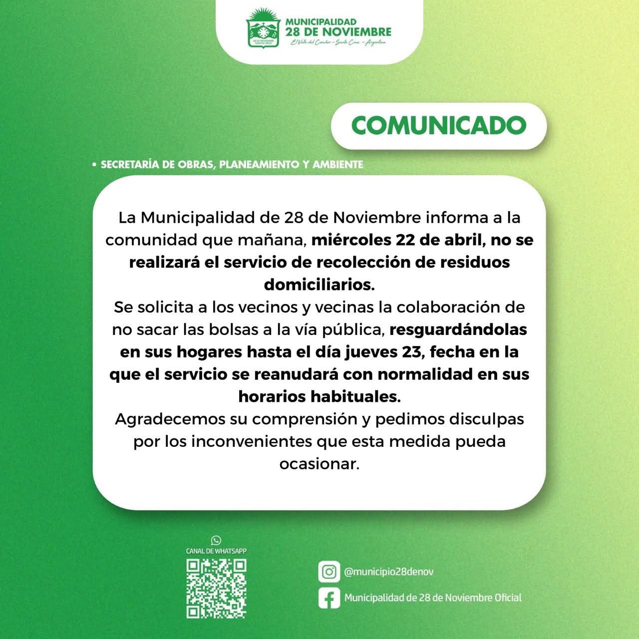 La Municipalidad de 28 de Noviembre informa a la comunidad que mañana, miércoles 22 de abril, no se realizará el servicio de recolección de residuos domiciliarios.