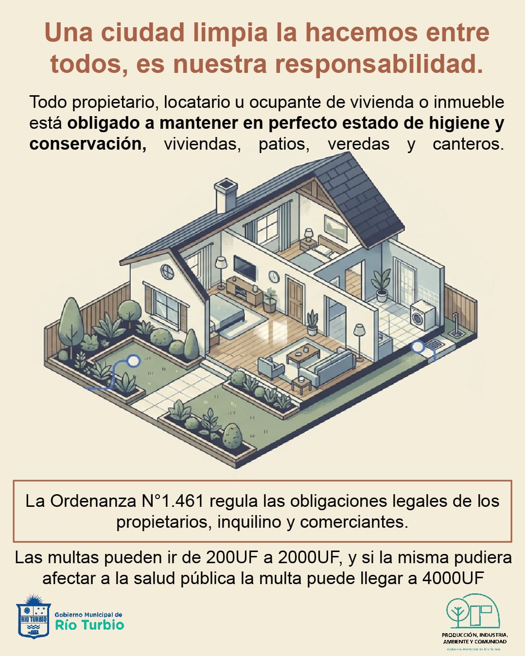 La Municipalidad de Río Turbio recuerda a la comunidad que todo propietario, locatario u ocupante de viviendas o inmuebles tiene la obligación de mantener en perfecto estado de higiene y conservación los espacios de su responsabilidad, incluyendo viviendas, patios, veredas y canteros.