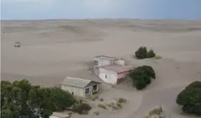 En el límite del pueblo, las ruinas hablan por sí mismas. Aún se distinguen restos de chapas, alguna teja solitaria resistiendo el avance del médano. Lo que fue un hogar ahora es apenas una sombra bajo la arena.
