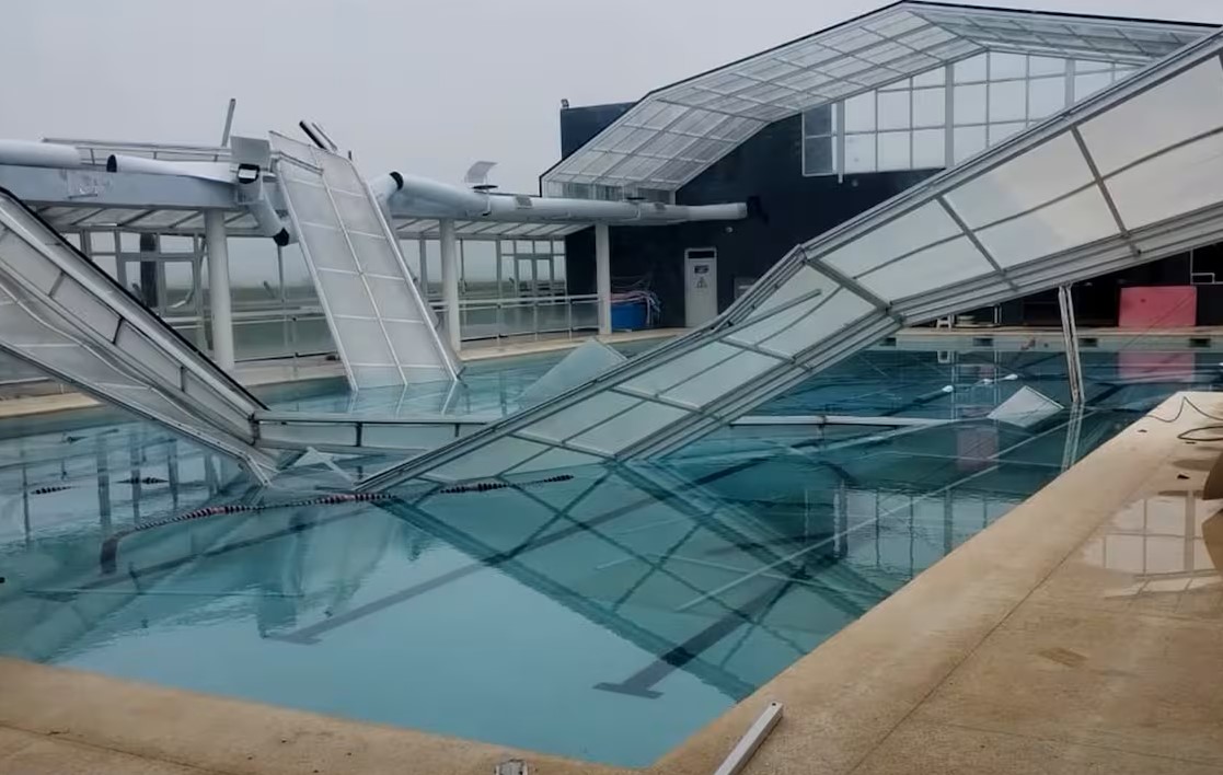 En ninguno de los casos se registraron personas lesionadas. El extremo de daño se advertía en el natatorio municipal Néstor Kirchner, con su cubierta que cayó precisamente hacia el centro de la piscina.