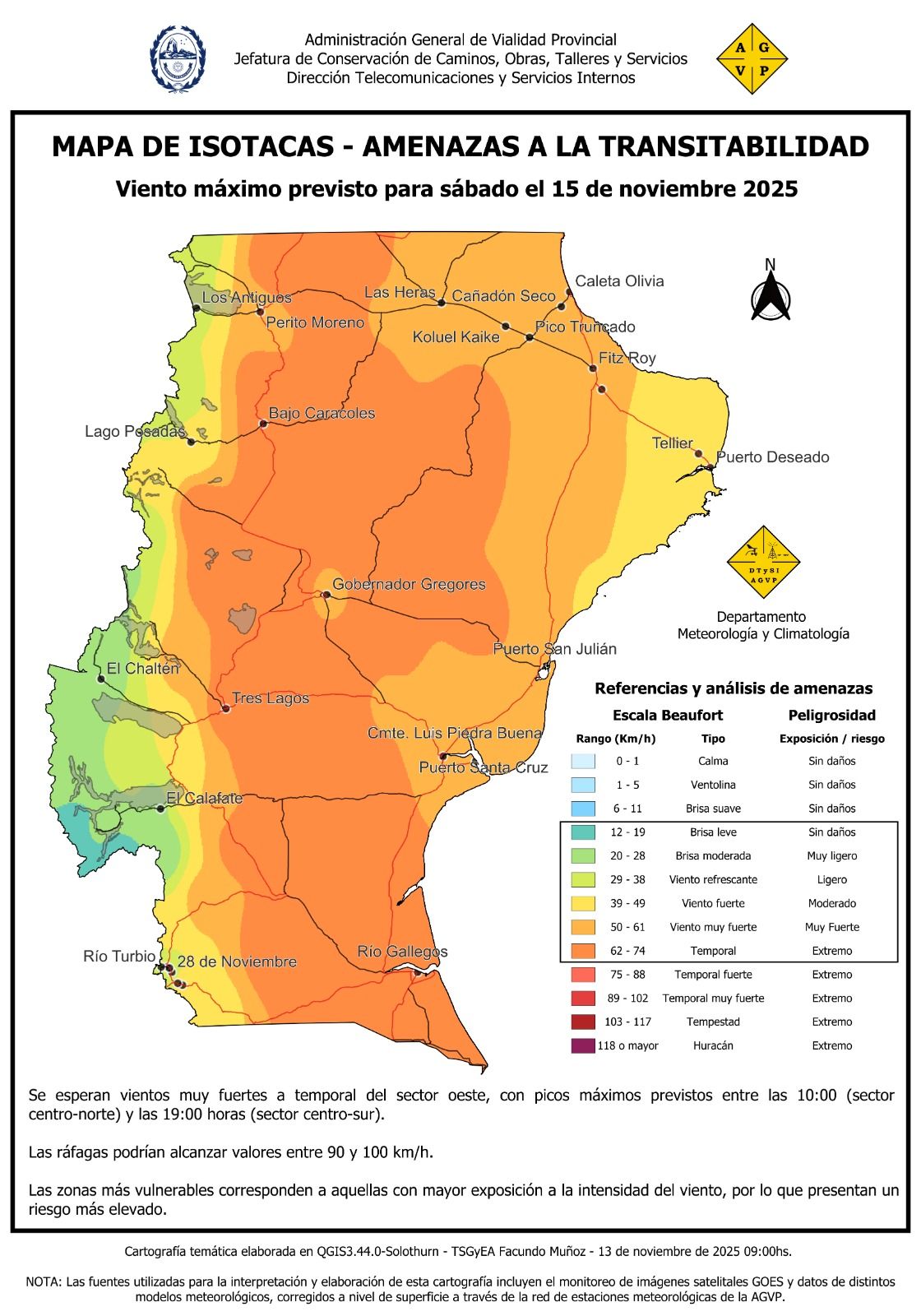 El área de Meteorología y Climatología de la AGVP elaboró un nuevo mapa de isotacas que advierte sobre posibles afectaciones a la transitabilidad en la red caminera provincial debido a vientos intensos previstos para el próximo sábado 15 de noviembre.
