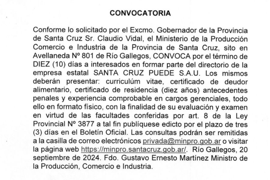 El Ministerio de Producción, Comercio e Industria de la Provincia de Santa Cruz, bajo la solicitud del gobernador Claudio Vidal, lanzó hoy una convocatoria abierta para conformar el directorio de la empresa estatal Santa Cruz Puede S.A.U.. El proceso de selección se llevará a cabo mediante un concurso público de antecedentes, una medida sin precedentes en la provincia que busca garantizar la transparencia y profesionalismo en la conformación del órgano directivo.