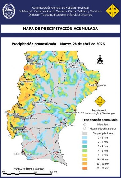 El Departamento de Meteorología y Climatología de la Administración General de Vialidad Provincial (AGVP) informa las condiciones meteorológicas previstas para el día martes 28 de abril, durante el cual se esperan precipitaciones en gran parte del territorio provincial.