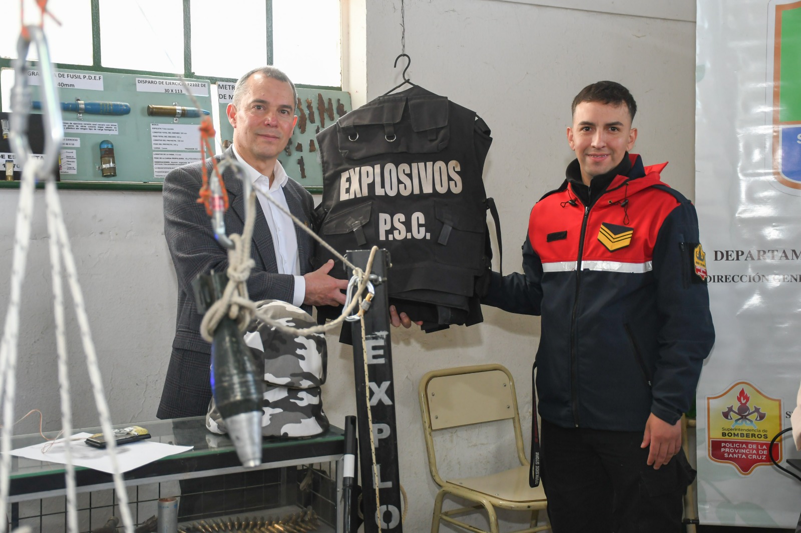 Las autoridades también hablaron con agentes que tienen la tarea del Grupo de Operaciones Especiales, quienes enfrentan situaciones de alto riesgo. Otro stand visitado fue el de la Subsecretaría de Protección Civil y Abordaje Integral de Emergencias y Catástrofes.