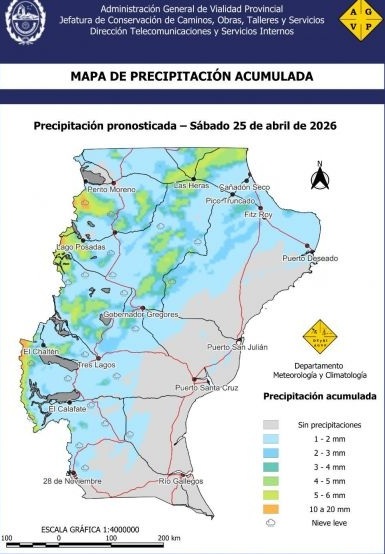 Se prevén lluvias generalizadas y precipitaciones en forma de nieve de baja intensidad, especialmente en las jurisdicciones viales de 28 de Noviembre, El Calafate, El Chaltén, Tres Lagos y Gobernador Gregores, y de manera más aislada en Perito Moreno.